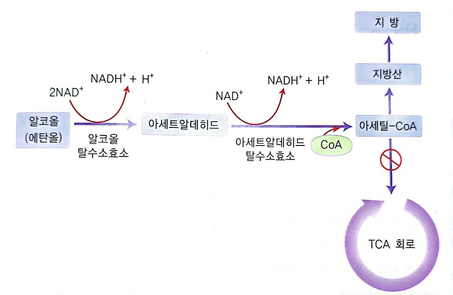 알코올은 소화과정이 필요하지 않으므로 공복 시 위장으로 순식간에 20%가량이 직접 흡수되어 1분 내에 뇌에 도달한다. 그러나 식후와 같이 음식이 위장 내에 있을 경우에는 알코올의 흡수는 지연된다. 위는 알코올 탈수소효소에 의해 알코올을 아세트알데히드로 분해하는데, 여성은 남성보다 이 효소가 적으므로 소량의 음주에도 쉽게 취한다. 위에서 흡수되지 않은 대부분의 알코올은 혈액을 따라 간으로 운반되어 간의 알코올 탈수소효소에 의해 아세트알데히드가 되고, 아세트알데히드는 다시 아세트알데히드 탈수소효소에 의해 인체에 무해한 아세테이트가 되어 혈액에서 이산화탄소와 물로 분해된다. 알코올로부터 아세트알데히드를 거쳐 아세틸 CoA를 생성하는 탈수소과정을 통해 NADH, H+를 다량 생성하는 NADH, H+를 생성하는 TCA 회로를 진행하지 않고 대신 NADH, H+를 소모하는 지방산 합성반응을 진행한다. 따라서 알코올 대사가 진행될수록 지방이 합성되어 지방간, 간경화로 이어지고 중간 생성물인 아세트알데히드가 축적되어 간세포에 손상을 준다.