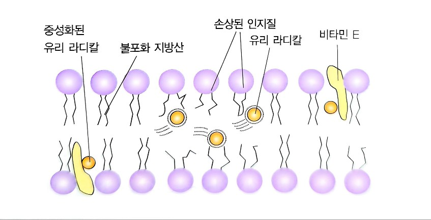 이러한 작용은 식품에서 뿐만 아니라 세포막 인지질의 다중불포화지방산 부분에서도 일어난다. 체내 혹은 세포막내에 유리 라디칼이 형성되면 유리 라디칼의 연쇄반응으로 지질이 손상되는 데 이때 비타민 E는 유리 라디칼의 생성 혹은 연쇄반응을 차단한다. 이와 같이 비타민 E는 항산화 작용을 통해 세포막 지방산의 과산화를 방지하며, 노화를 막고 암발생을 막아준다.